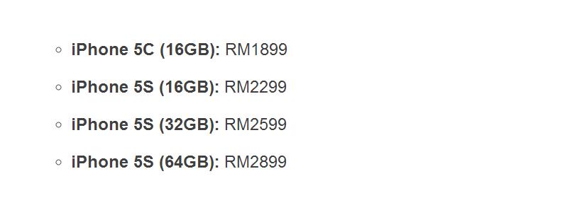 - The pricing of the iPhone 5S and iPhone 5C that are stated below may not be the same for all mobile operators. This is because Apple has no control over the final price, for reasons unknown to us, similar to what happened last year (DiGi has set the Phone 5 retail pricing higher).